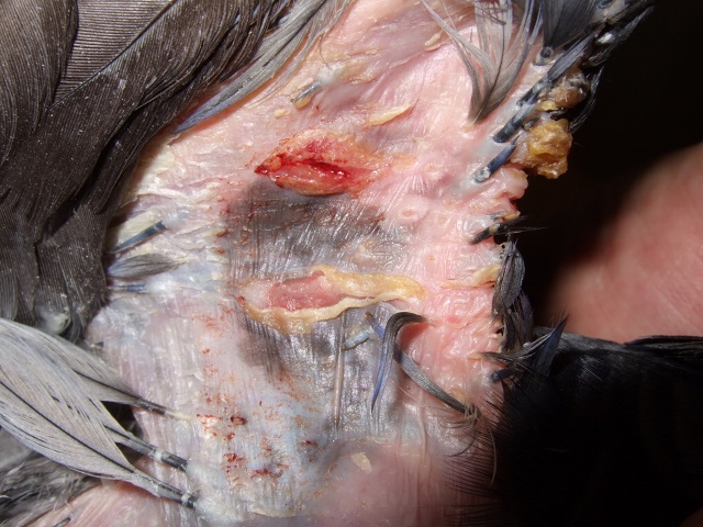 いつまでたっても治ってこないため、カラーを通常のラッパ型のものに変更する。 このタイプは、あーぽんの心的負担が大きいのでずっと避けていたのだが、そうも言ってられなくなり心を鬼にして断行。 さすがにフガフガ言ってて情緒不安定。ほとんど動かない。 それでも、飼い主が留守にしている昼間、ちゃんとご飯を食べていた。えらいなぁ。 当時はカラーを付けたまま嘴でカサブタを取る方法が何かあるのだと、私はずっと思っていました。 でも実際は、羽根を広げる度にカラーの縁がひっかっかって出血していたのと、恐らく、この頃からもうすでに脚でカサブタを取っていたのだろうと思います。 ラッパ型カラーにしてからも、カサブタが大きくなる度に取られてましたから・・・。 もう少し早くそれに気づけていれば、治るのも早かったのにね(^^; | アーカイブ