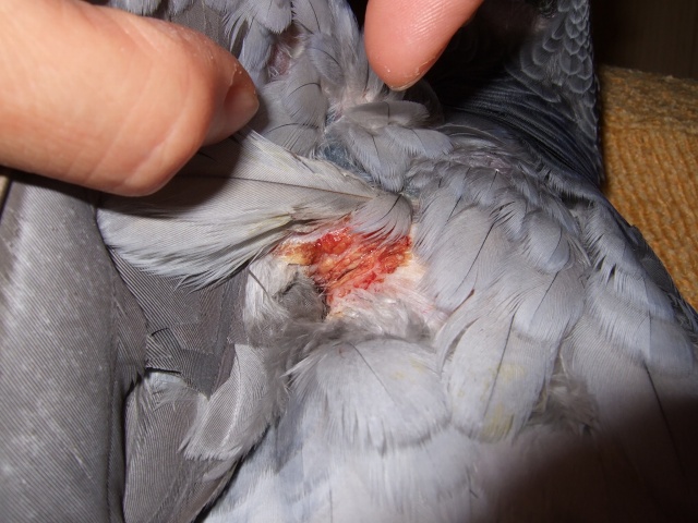 ヨウムのあーぽん(♀)の自咬の記録です。 PR 2007年11月8日。