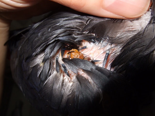 2008年8月15日。 肩口にでっかいカサブタができてしまい、腫瘍ではないかと焦る。 結局はでっかいただのカサブタでした。 カラーが擦れて出血を繰り返すうちに、だんだんでかくなっていったのでした(^^; 肩のところ カサブタ取られた