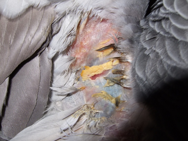 周りの羽根が無いのは、カサブタが毛根をふさぎ、途中で息絶えてしまうため。