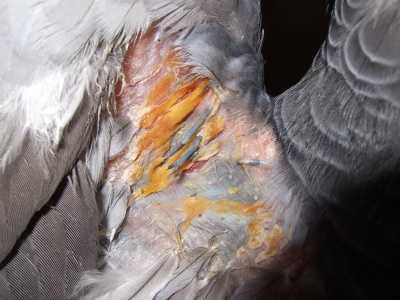 エリザベスカラーを逆向けにつけているので(てるてるボーズみたいに)、翼を思いきり開いたり、羽ばたいたときに丁度この部分が擦れるのだ。