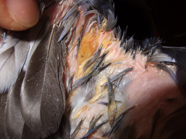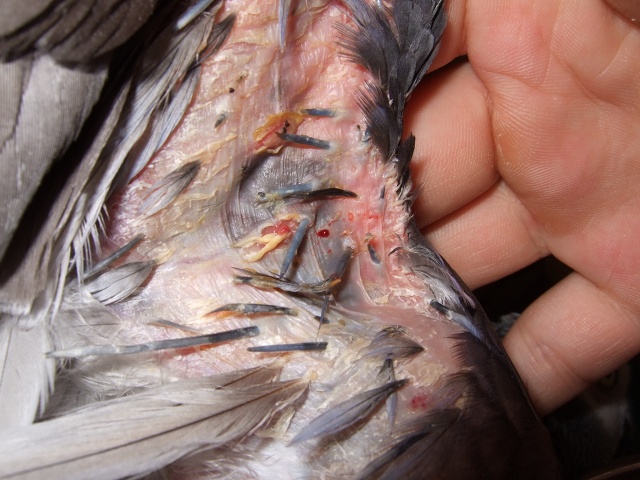 毛づくろいのときに、翼の傷が触れない変わりにお腹側を掻いていたようだ。